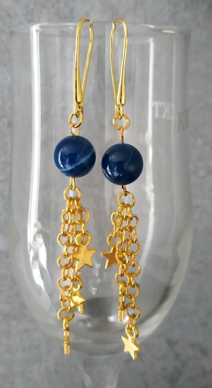 Серьги - крючок ЭКО латунь. Бусины – синий натуральный полосатый агат + металлические подвески звёзды. Размер 8,5 см.