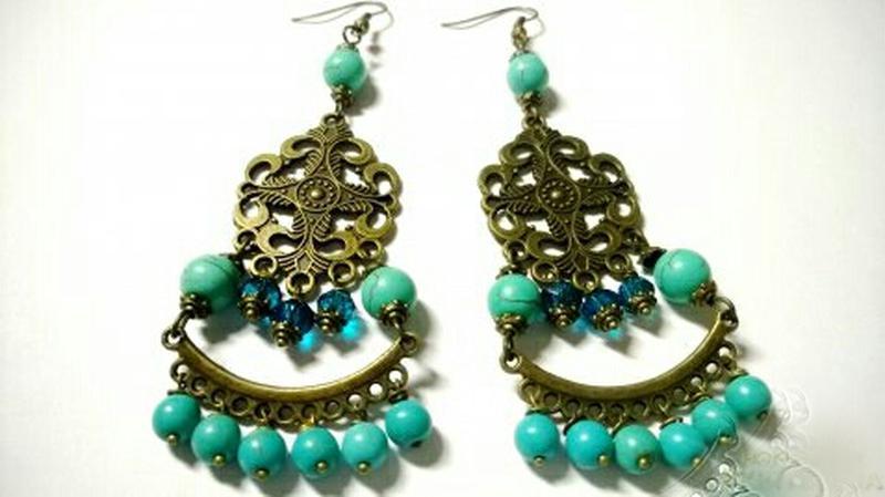 Сережки «Бирюза». Материал: прессованная бирюза, чешские хрустальные бусины, фурнитура бронза. Длина 9 см.