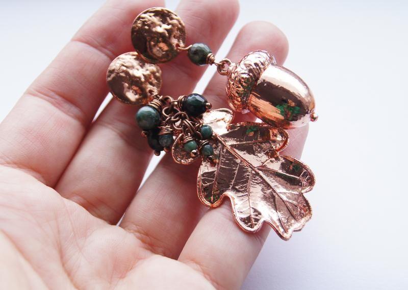Серьги асимметричные "Достаток" Материалы: - медь - Яшма Листья и желудок покрыты медью, техника гальваника. Размер по заказу. Могу сделать по вашему вкусу. Застежки на серьгах гвоздики. В подарок коробочка. Дополнительные характеристики: Цвет : Зеленый Материал : Бусины Материал : Медь
