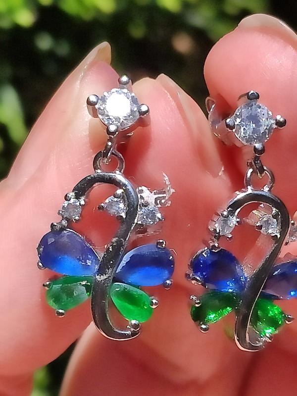 Сережки гвоздік і,у вигляді метелика 🦋,зелені,сині і білі фіаніти ,невеличкі і ніжні