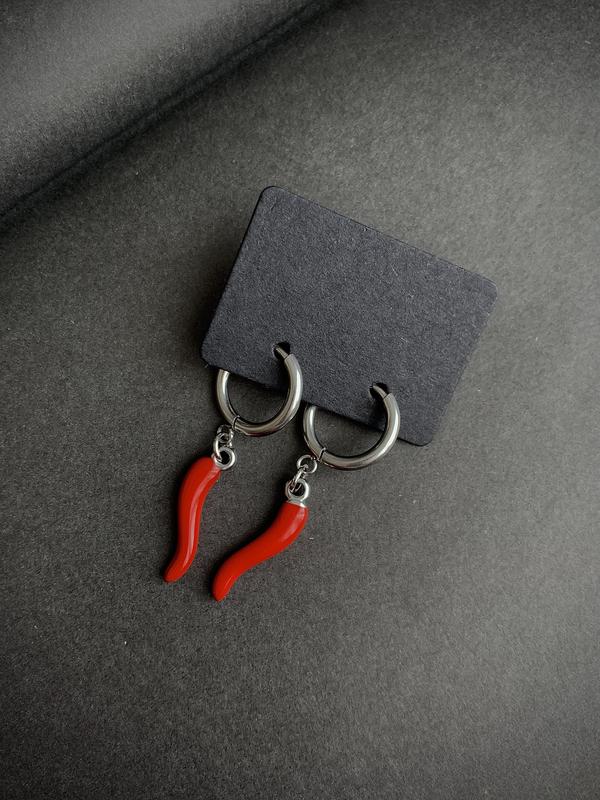 Стильні літні сережки перчинки виконані з ювелірної нержавіючої сталі. Стійка до води, поту і парфумів, кремів. Доповнять ваш образ яскравістю або зроблять акцент у вашому образі. У будь-якому разі ні вас ні оточення не залишать байдужими. Можна поєднувати з підвіскою в такому ж стилі. Кільця зі сталі діаметр 15 мм Довжина перчинки 20 мм Загальна довжина сережок 37 мм В єдиному екземплярі.