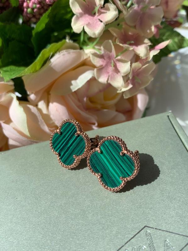 Серьги ван клиф в брендовой упаковке на английском замочке с розовым золотом au750, зелены...
