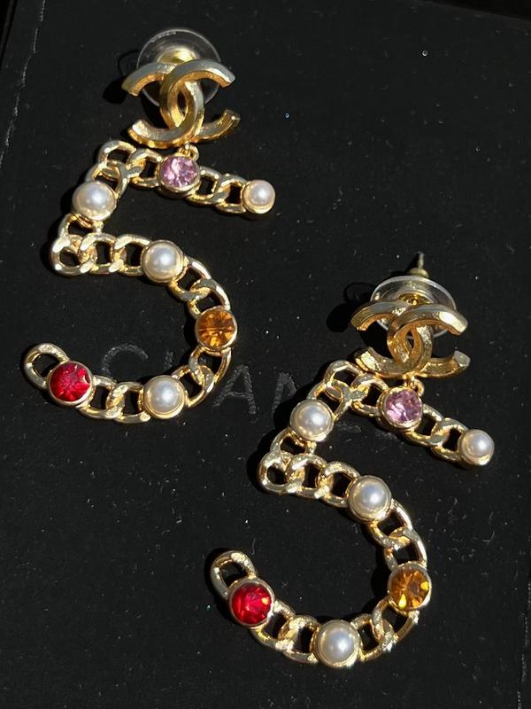 Серьги-подвески шанель цифрой 5 с разноцветными камнями, позолота 18к