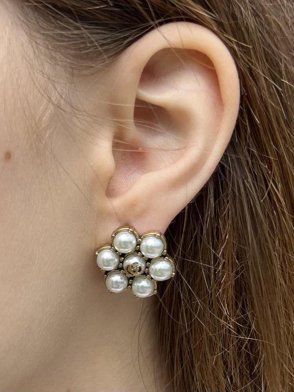 Сережки гуччи в виде цветка из жемчуга с логотипом, позолота 18к