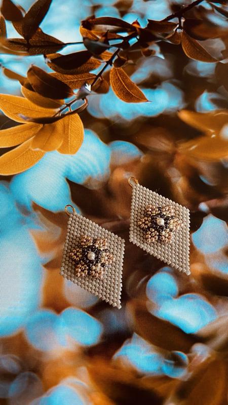 Сережки створені за мотивами архитектурного декору на Подолі у місті Київ Матеріали: яп. бісер, латунь, позолота (14к) Розмір: 45 х 30 мм (без швензи)