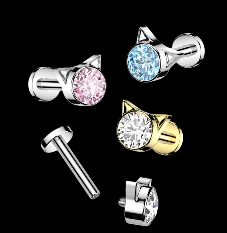Лабрет (серьга) пирсинг котик-кошка из титана с фианитами •для пирсинга хряща, козелка, мо...