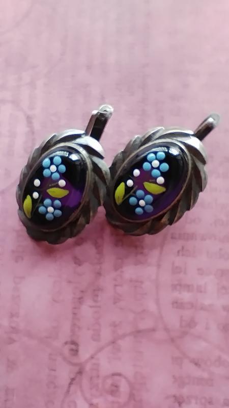 серьги с вставкой из аметиста, росписного вручную. материал мельхиор с посеребрением. производство Польша. винтажное яркое украшение.