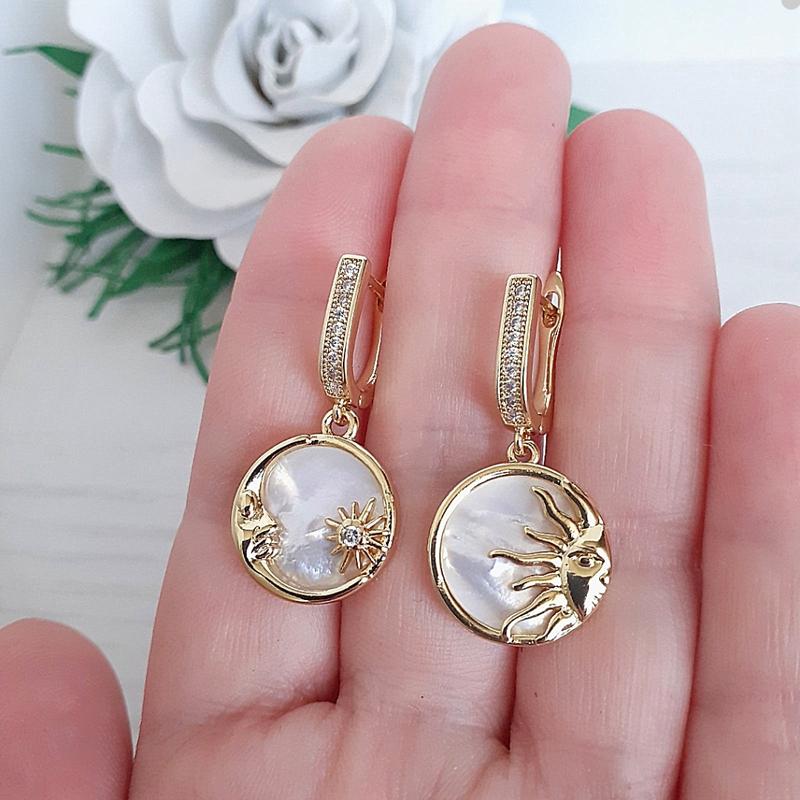 Позолоченные серьги ручной работы с подвесками с натуральным перламутром. Размер подвески 15 мм Длина серег составляет около 34 мм. Верхушка серег - латунь с позолотой, с фианитами. Подвеска - латунь с позолотой, с перламутром и фианитом Застежка - Английский замок.
