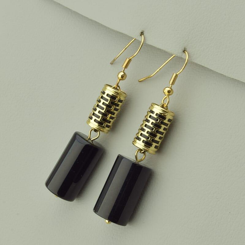 Размер серьги: 55х10 мм. Тип замочка: Петля Материал: Бижутерный сплав Камень: Агат(нат.) Цвет: Черный Цвет3: Золотой