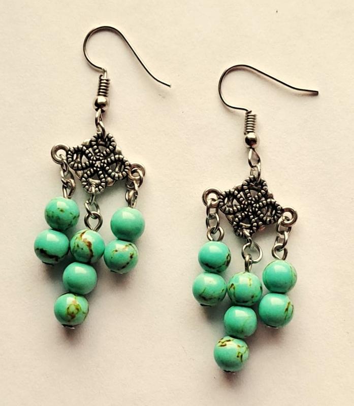 серьгти из прессованной бирюзы, бусина 6мм, металл бижутерный длина ок 6, см возможны варианты, доп. фото по запросу