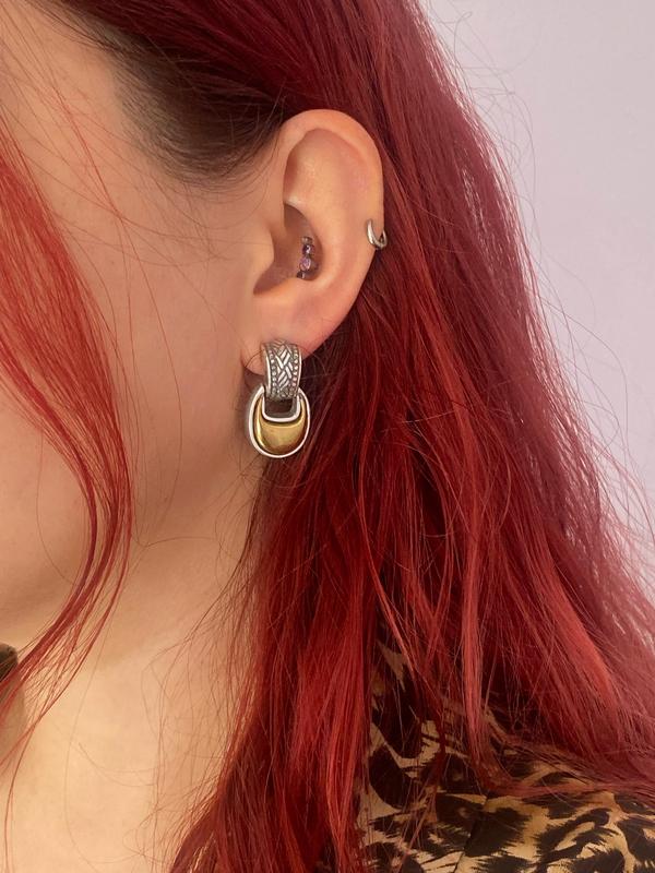 Серьги Пьяшки, которые сочетают в себе серебряные и золотые элементы. Сверху интересная текстура переплетения, на нижней части - гладкая поверхность золотого тона. С внутренней стороны очень красивая гравировка сердечек😍 🔸Размер: 3х1,6см 🔸цвяшки 🔸без маркировки (возможно Brighton) 🔸Есть следы времени и небольшие царапины