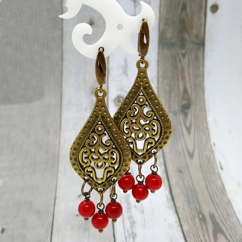 🍒🌻Серьги в украинском, этно-стиль под ожерелье, под вышиванку. Украшены подвесками-шариками из натурального коралла пресс. Швенза - английский замок бронзового цвета. Основа серег - ювелирный сплав под античную бронзу. Размер вместе со швензой - 6 см. Размер основания 4 х 2 см, бусина коралла 6 мм.🌻 Состав: сплав под бронзу, натуральный коралл пресс.
