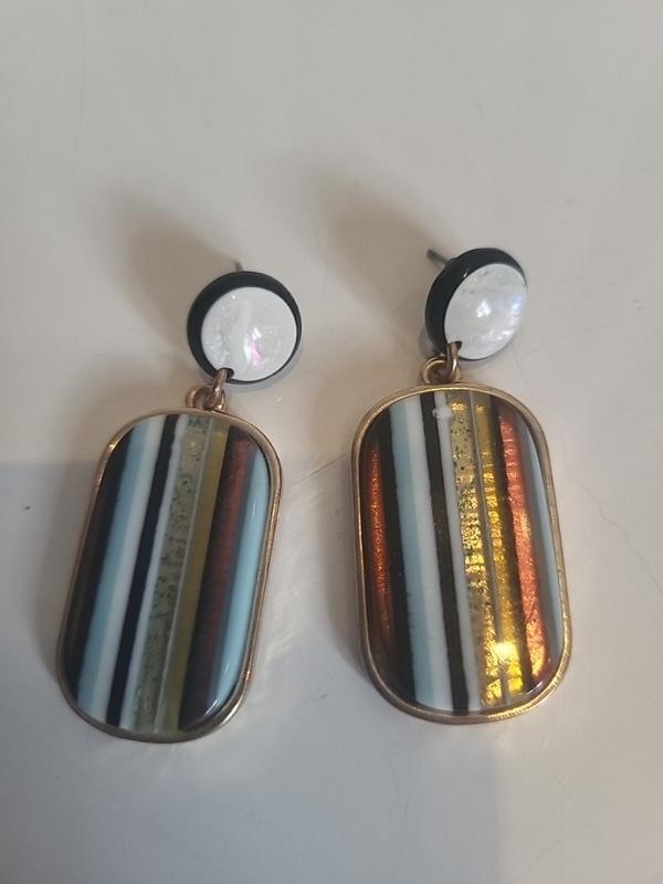 Будьте смелыми в этих массивных серьгах-подвесках. Большие металлические подвески золотистого цвета инкрустированы разноцветной полосатой панелью с металлическими деталями и свисают с жемчужных круглых серьг-пусетов. Лучше всего их носить с более нейтральной одеждой, поскольку эти яркие серьги говорят сами за себя. Серьги-подвески с несколькими полосками, 11,60 евро, Accessorize
