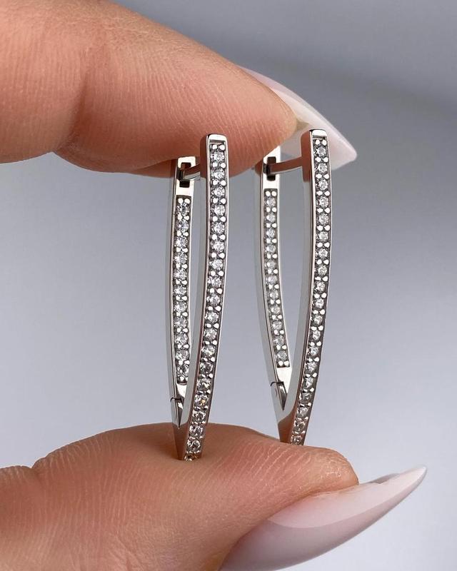 Серебряные серьги Средний вес -- 4,76 г Серебро 925 пробы Покрытие родий Вставки -- кубические цирконии Длина -- 3,5 см Наши преимущества: - Высокое качество: настоящее серебро 925 пробы. - Простой дизайн: подходит для любого случая. - Удобство: легкость и комфорт в носке каждый день. - Доступная цена: стильный вид без переплат. - Гарантия качества: На всех изделиях стоит Штамп Государственной Пробирной Палаты Украины, соответствующая проба, бирка со всей информацией от производителя, все изделия опломбированы, что подтверждает их подлинность и высокое качество. Перед оформлением заказа наличие уточняйте, пожалуйста, у ***** или ******** +38********** Отправка (при наличии товара) или изготовление только по предоплате 50% или полной оплате на карту Приватбанка или Монобанк Час изготовления до 3 недель (при отсутствии на складе)