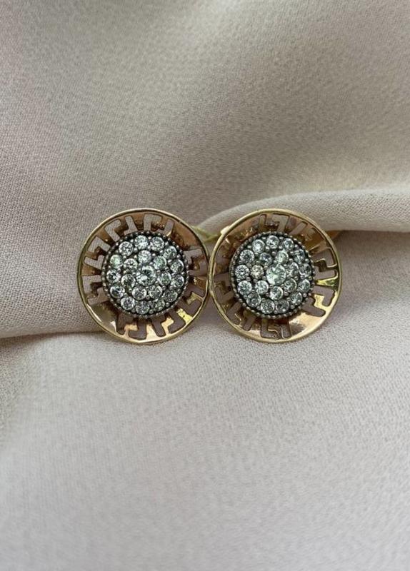 Золоті сережки 585 проби круглої форми з грецьким візерунком навколо і всередині із вставками куб. Цирконію білого кольору, вага виробу 5,03 грами