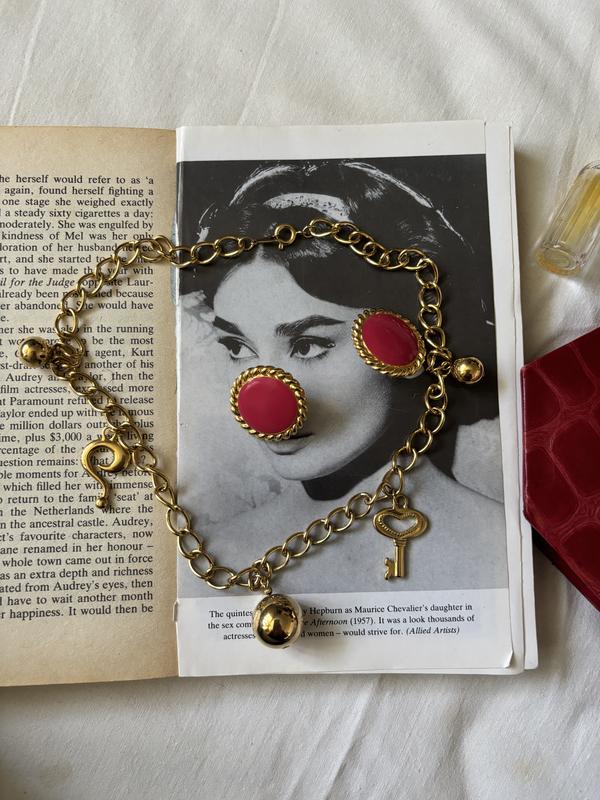 Чокер (Ланцюг) 750📮 Довжина 42 • Вид: Масивний, золотистий ланцюг із великими, овальними ланками. • Деталі: Прикрашений значними підвісками (шармами), зокрема великою полірованою сферою та декоративним ключем. • Стиль: Сміливий, акцентний, відповідає моді на масивні ланцюги. Сережки (Кліпси)-350📮 • Вид: Круглі, помітні сережки (або кліпси). • Дизайн: Центральна частина покрита яскравою, насиченою фуксієвою (або рожевою) емаллю. • Оправа: Емальований центр обрамлений товстим золотистим обідком із витою (канатною) текстурою. • Акцент: Створюють сильний колірний і текстурний контраст із золотом.