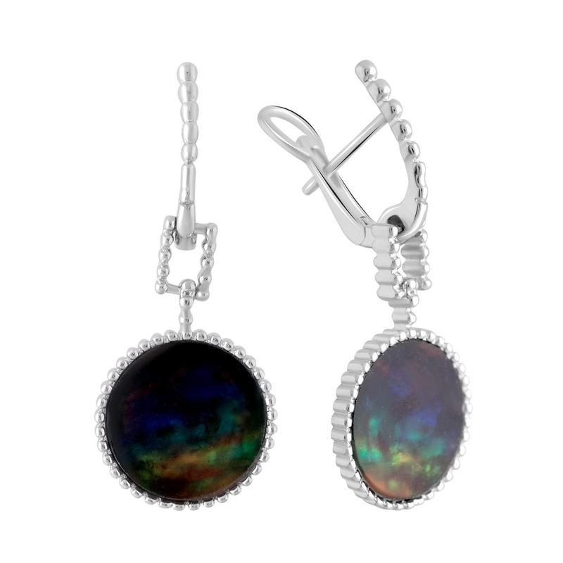Родированые серебряные серьги 925 пробы с искуственным аммолитом. Родированные украшения дольше сохраняют свое первоначальное состояние, а именно цвет и блеск металла. Все ювелирные изделия представленные на нашем сайте прошли внутренний контроль качества, а также контроль государственной пробирной службой Украины, на всех изделиях стоит соответствующая проба. К каждому ювелирному украшению прилагаются бирка с указанием всех параметров.*Цвета изделий на сайте могут незначительно отличаться от реальных из-за особенностей цветопередачи экрана