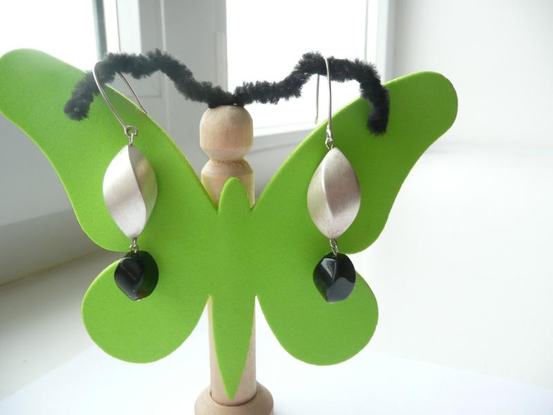 Серьги серебряные, матовое серебро + черный камень, длина ок. 6 см,