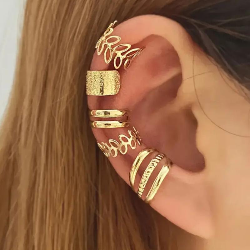 Кафи, сережки на хрящь вушка-модний тренд сезону! Благодаря обманкам-каффам, вы можете выглядеть стильно, без болезненных проколов! В наборе 5 кафф различных моделей, которые вы можете носить на любой части ушного хряща, как одновременно, так и отдельно не причиняя себе боли и дискомфорта! Каффы регулируются - они сжимаются и разжимаются, под размер вашего ушного хрящика. Состав: бижутерный сплав Цвет: золотой (в ассортименте есть серебристые и черное серебро – наличие и цена цветов, обязательно уточняйте перед заказом)