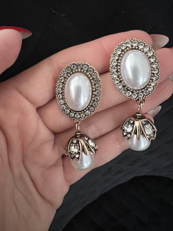 Елегантні вінтажні сережки з перлиною преміум якості— ідеальний аксесуар для святкового образу або вечірки. Овальна верхня частина інкрустована дрібними кристалами навколо великої перлини; підвіс — крапля-перлина у “квітковій” металевій оправі з кристалами. Колір: сріблясто-білий перламутр + антик-золотистий/бронзовий метал. Гвоздик (пуссет) із заглушкою.