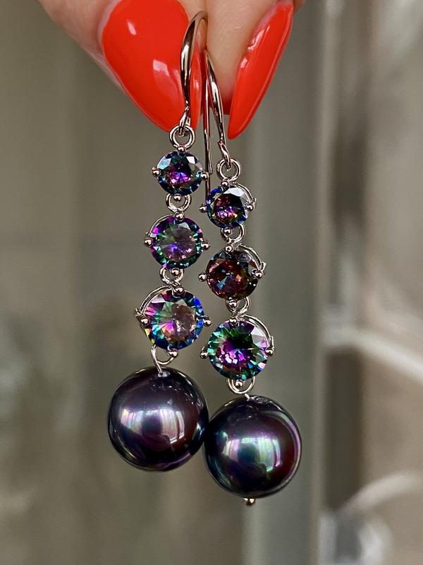 Новi масивнi сережки з перлами Майорка та мiстичних кварцiв. Сережки виготовлено в одному екземплярi. Біжутерія Люкс класу. В сережках елегантна застiбка петля. Сережки покритi родiєм 999 проби. Розмір перлин 10 мм. Нижня частина сережки рухома. Сережки можуть бути на подарунок. Фотографії знято на звичайний телефон, без спалаху та сторонніх програм. Всі мої речі та аксесуари якісні, покупкою залишитесь задоволені) За необхідності зроблю Вам додаткові фото та з радістю відповім на всi Ваші запитання