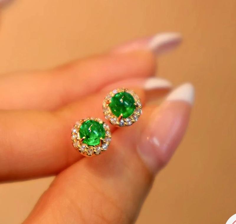 Новые серьги с изумрудными кабошонами в окружении фианитов. Высота 7 мм. Силиконовые застежки. Спрашивайте, предоставлю всю необходимую информацию