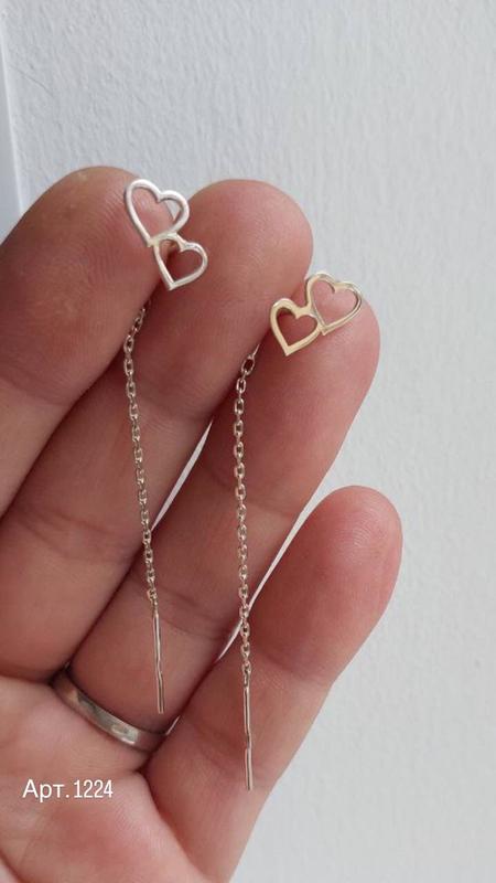 Сережки протяжки срібло 925 проби два сердечка одинарні позолота