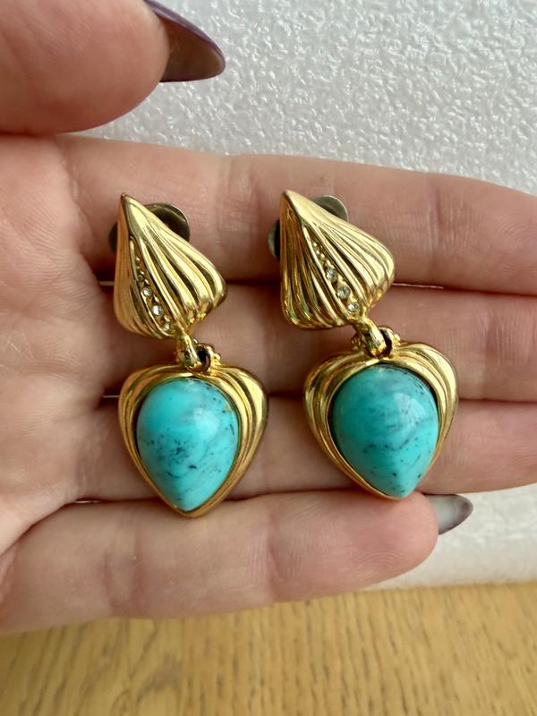 Коктейльні сережки-кліпси яскраві, ефектні й мають виразний вінтажний шарм. Шикарний візуальний контраст: бірюзовий кабошон на золотистому тлі. Якісна обробка: рельєфна верхня частина, акуратна посадка каменя, блиск дрібних кристалів.