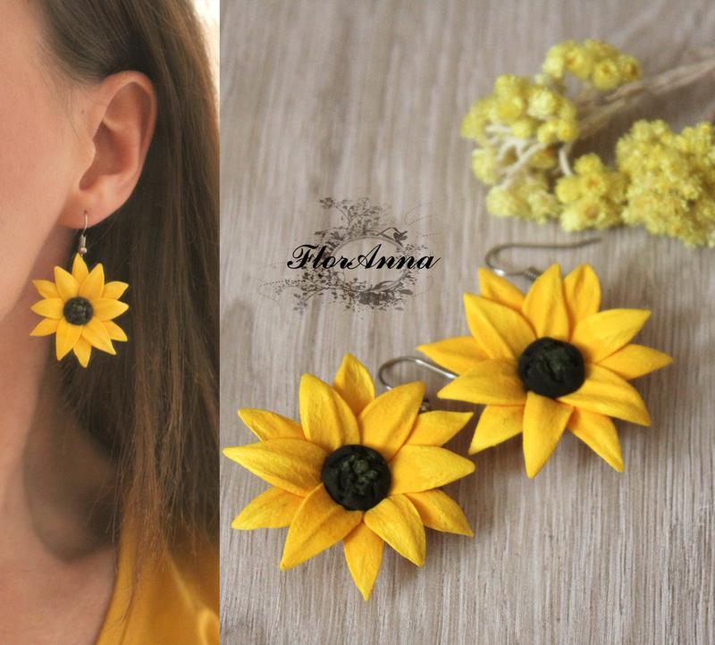 Желтые серьги подсолнухи ручной работы из полимерной глины