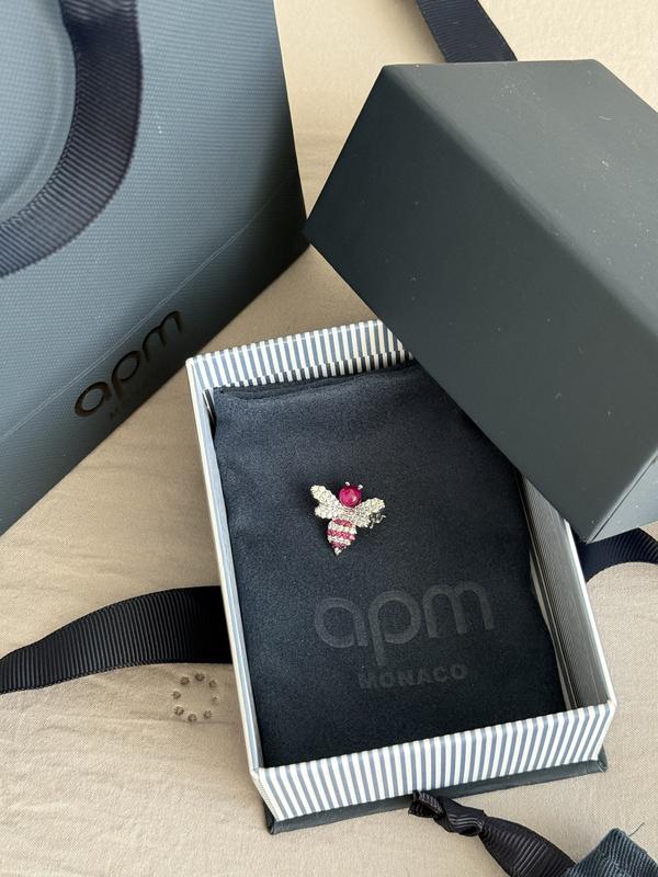 Брошка від бренду APM Monaco. Нова, в фірмовій коробці, мішечок та повному подарунковому упакуванні. Срібло 925-проба, цирконій та синтетичний рубін. Модель має складний дизайн (джміль/бджілка з кольоровими вставками). Купували за 120€