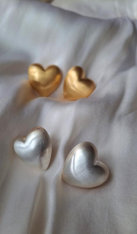 Трендовые серьги в виде сердечек из ювелирной стали с матовой поверхностью. Очень эффектно смотрятся🤍💛 • Материал: ювелирная сталь • Форма: объемные сердечки • Покрытие: матовое • Цвет: золотистый и серебряный • Гипоаллергенные • Устойчивость к воздействию воды Подарункове пакування