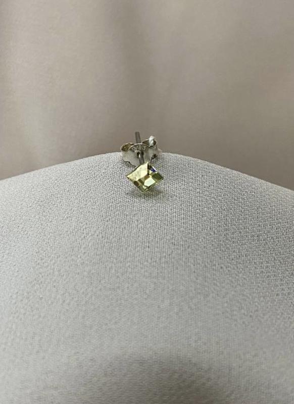 Срібна моносережка 925 проби з фіанітом квадратної форми салатового кольору, вага виробу 0,20 грам.