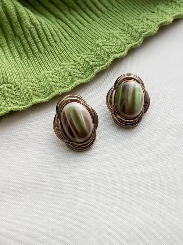 🌻Винтажные овальные клипсы с мраморными кабонами в сложной природной палитре – сочетание оливково-зеленых, молочных и теплых коричневых оттенков. Вставки имеют мягкий перелив и выглядят как натуральный камень, придающий украшения глубины и характер. Крупные, но легкие, изготовлены из пластика. Отличное состояние 🔥 Размер 3,5 см * 2,9 см