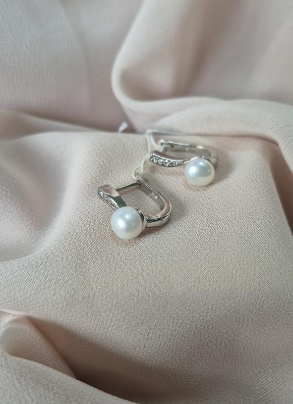 Срібні сережки 925 проби із вставками натуральних перлин білого кольору та білих фіанітів, вага виробу 3,65 грам.