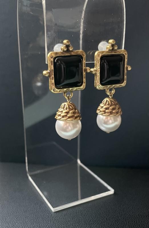 Сережки - підвіски у вінтажному стилі з чорними квадратними вставками та білими перлинними підвісками. Метал - мідь, позолота 18К Вушна голка - срібло Вага 22гр Розмір 2.4*5см