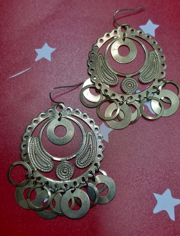 Стильные серьги для любительниц яркой бижутерии, носились немного, но кое-где поблек "золотой" блеск. Длина 7см, диаметр большого круга 4,5 см.