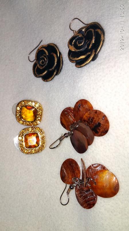 комплект серёжек. гвоздики Avon очень яркие. бронзовые розочки handmade полимерная глина. и сережки с круглыми висюльками ракушка)) подарок к любой купленной вещи