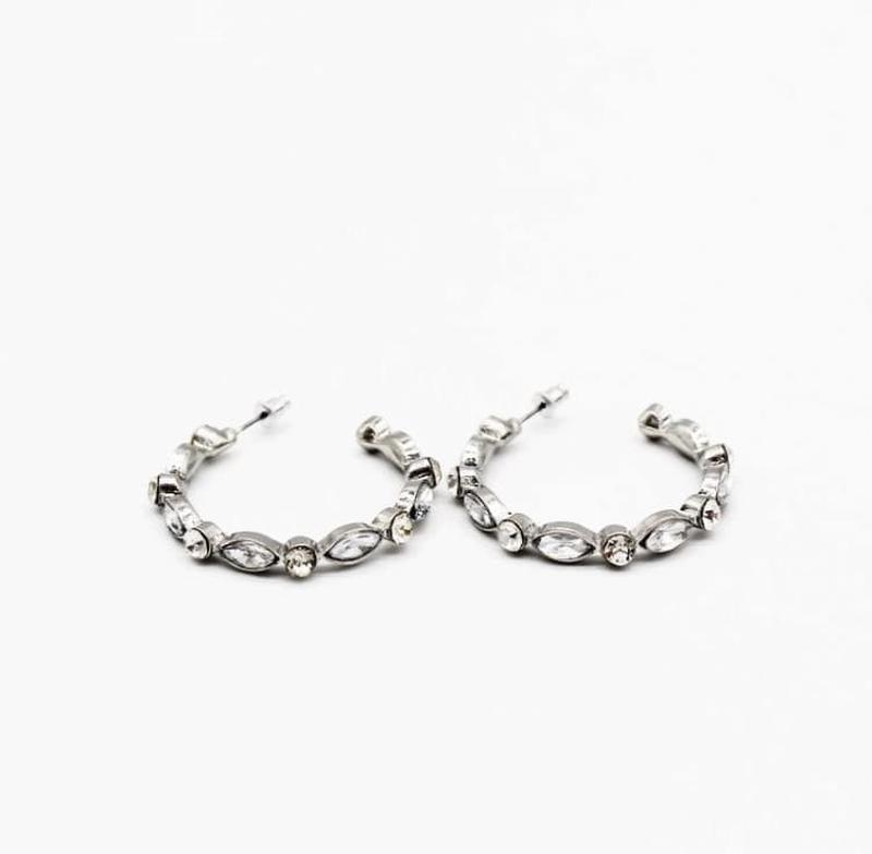 серьги полукольца, с белого металла, камушки прозрачные красиво сверкают от света застежка "гвоздики", диаметр 4 см