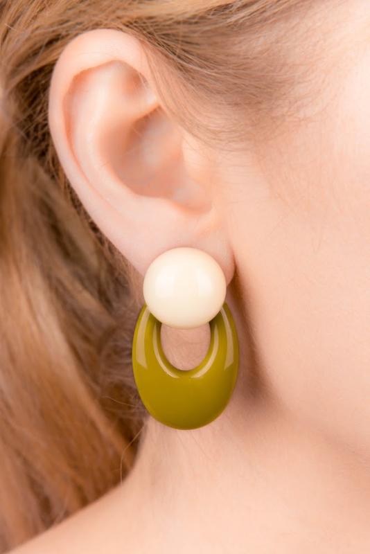 Сережки овальної форми оливкового кольору. Легкі та стильні. Мочку вуха не відтягують. Матеріал: пластик та біжутерний сплав Довжина: 4 см Ширина: 2 см Уникати контакту з водою.
