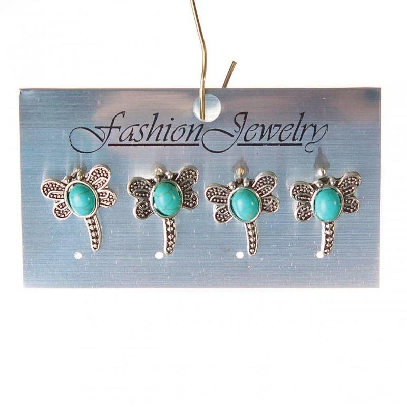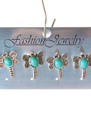 [20 мм] Серьги женские набор 4 шт. с камнем голубая бирюза с прожилками, стрекозы