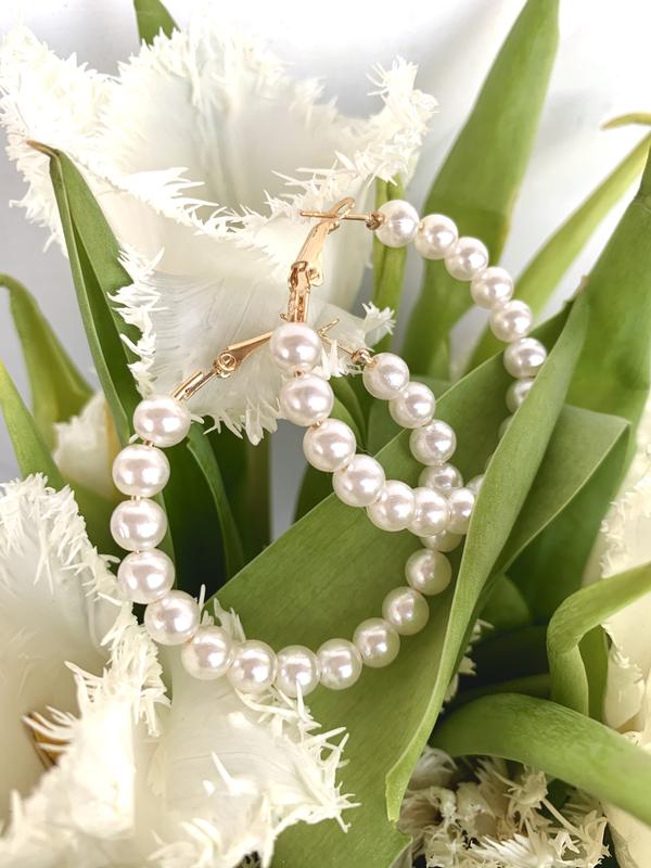 В наличии новые жемчужные серьги кольца. Фурнитура золото, жемчуг пластик. Диаметр 4 см.