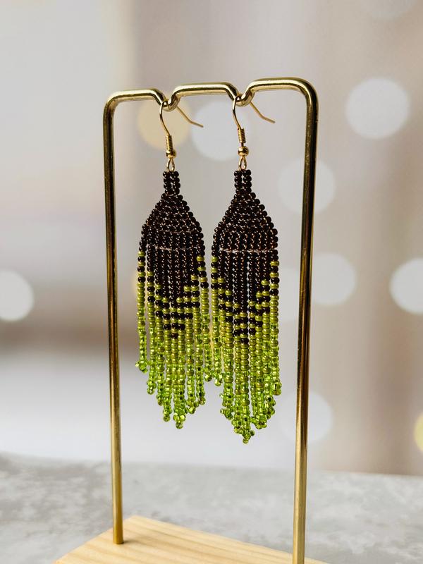 Эти бисерные серьги созданы для тех, кто любит весенние краски. Градиентный узор этих серьг из бисера выполнен в трех цветах. Основной цвет темно-коричневый, затем идет оливковый, а заканчиваются серьги ярким салатовым цветом. Серьги имеют небольшую длину, поэтому их комфортно носить длительное время. Размер: Длина серег - 9 см. Ширина сережок - 2 см. Изделие имеет подарочную упаковку. Материалы: чешский бисер - золотистая фурнитура из нержавеющей стали - силиконовая застежка