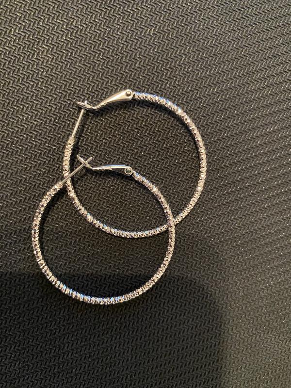Очень красивые серьги кольцами диаметр 4 см. На серьгах сделаны насечки, очень красиво и дорого смотрится. Бижутерия высокого качества, без дефектов