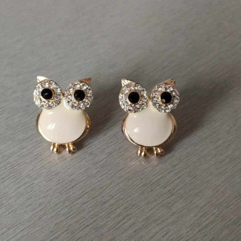 Красивые сережки Совушка с камнями и эмалью молочного цвета Качественный бижутерный сплав, не темнеет
