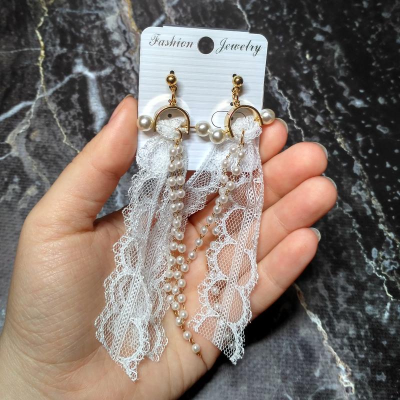 Стильные, элегантные кружевные сережки. Идеально дополнят любой нежный образ. Застежка - гвоздик Фурнитура под золото, бусины - имитация жемчуга Общая длина - 10,5 см Ширина кружева - 2,5 см