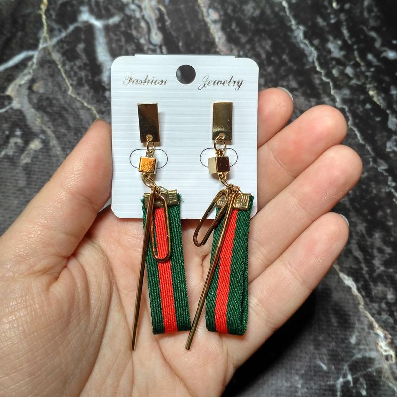 Стильные, элегантные сережки. Идеально дополнят любой нежный образ. Застежка - гвоздик Фурнитура под золото Общая длина - 7 см Ширина ленты - 1 см
