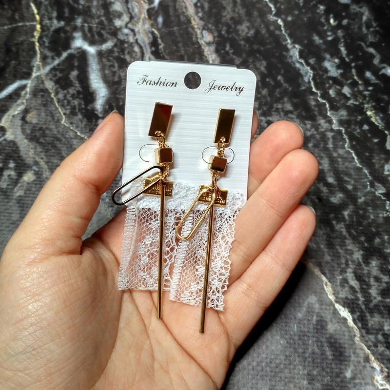 Стильные, элегантные сережки. Идеально дополнят любой нежный образ. Застежка - гвоздик Фурнитура под золото Общая длина - 7,5 см Ширина кружева - 2 см