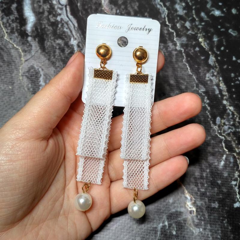Стильные, элегантные сережки. Идеально дополнят любой нежный образ. Застежка - гвоздик Фурнитура под золото, бусины - имитация жемчуга. Общая длина - 9 см Ширина кружева - 1,5 см