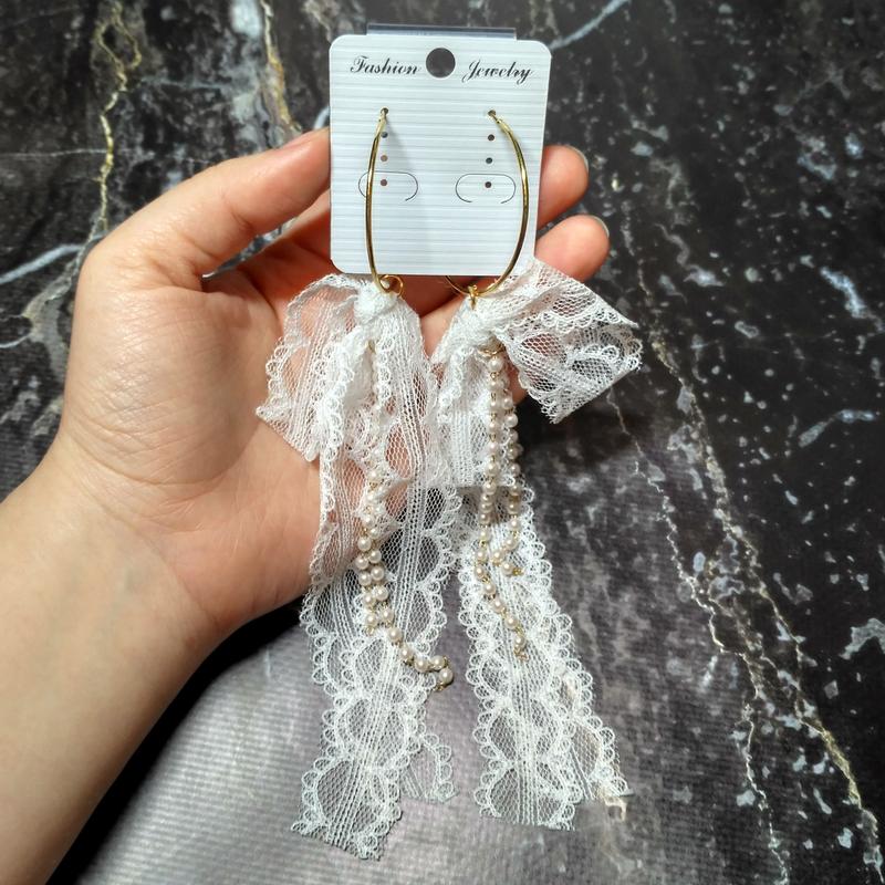 Стильные, элегантные сережки. Идеально дополнят любой нежный образ. Застежка - гвоздик Фурнитура под золото, бусины - имитация жемчуга. Общая длина - 17 см Диаметр кольца - 3,7 см Ширина кружева - 2,3 см