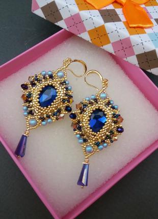 Нарядные серьги из ювелирного бисера, кристаллов и жемчуга Сваровски. Ручная работа, выполнена в единственном экземпляре. Швензы с гипоаллергенным родиевым покрытием. Длина сережек 7 см.